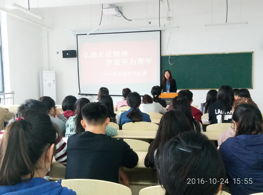 ![]() ![]() 10月24日下午,医学院学生支部成员和院红色社团全体成员在公教421室集中收看了纪念红军长征胜利80周年大会视频,聆听习近平总书记发表的重要讲话,并开展了一场别开生面的最佳党日活动。 今年是工农红军长征胜利80周年,正值我院新校区正式启用,分院以此为契机,克服新校区运行初期的困难,创新最佳党日活动形式,通过“你讲我学,我问你答”,围绕主题,设计任务项目,由红色社团的成员根据任务项目组成团队,分别负责图文资料收集,理论言论整理,长征故事汇编等项目,建构起一幅长征精神的立体画面,让参会师生在学习、问答中更深入地认识长征这一历史壮举,也更深刻地理解长征精神的深远意义,更加坚定了不忘初心继续前进的雄心壮志。整场活动气氛活跃,师生受益良多。 分院党总支陈靖靖书记说,在此工农红军长征胜利80周年和学院新校区启用之际,分院通过组织此次最佳党日活动,旨在希望党员同志和红色社团全体成员要继承和弘扬伟大的长征精神,坚定理想信念,不畏困难,敢于担当,懂得合作,争做时代有为青年,为实现光荣而又美好的梦想而努力奋斗。 15药学(3)班鲍璐同学说,通过此次活动,自己不仅了解了长征精神,让自己明白长征对于中华民族的伟大意义,也学会了自己去找寻问题解决问题的方法办法。青年党员代表沈昕宇老师说,通过此次活动系统学习了长征精神,坚定了自己要把长征精神投入到今后的工作与学习中去的信心,让困难磨炼自己,让目标引领自己,只有经历艰难困苦,才能玉汝于成。医学院党总支副书记张玉玲说,这次专题党日活动不仅是一次思想的升华,也是一次育人方式的尝试,通过翻转师生角色,让学生感受到自己在校园生活中的主体价值,也有助于学生自信心、自豪感的提升。 此次活动也是医学院“两学一做”学习教育的重要组成部分。(宋建兰) |