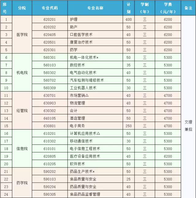 备注:以上专业及计划数以省教育考试院公布为准,在录取过程中,根据考生报考及考核情况,经省教育厅批准可适当增加。以上标注*的专业可以享受企业助学金,每生每年享受2000元,享受2年时间;以上标注△的专业可以享受企业助学金,每生每年享受1000元,享受2年时间。