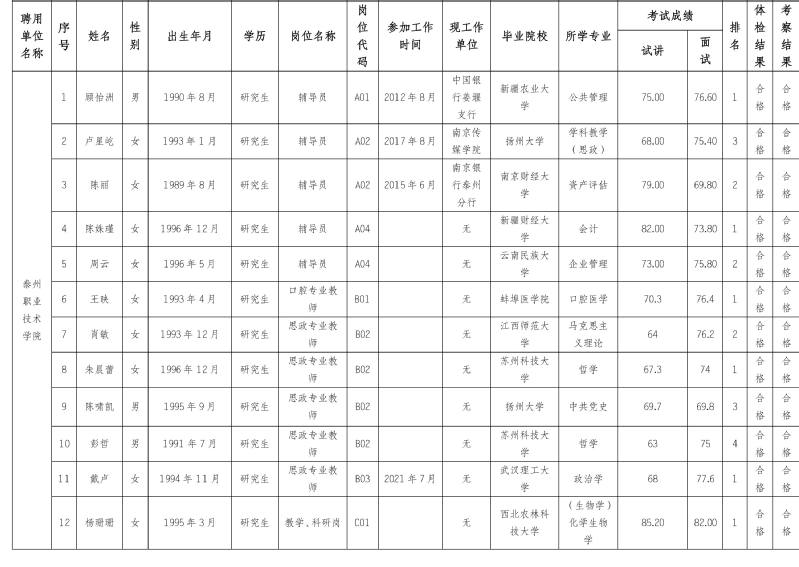 附件:泰州职业技术学院2022年公开招聘高层次及紧缺人才拟聘用人员名单(第一批)