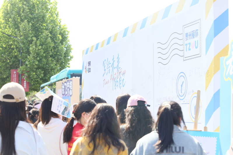 活动期间,还举办泰州早茶进校园、青春留泰歌会、“百企万岗”招聘区,展示留泰安居补贴政策及“衣食住行”全方位福利,在泰各高校共计2.2万名学子参加。现场围绕“留泰”设置多个互动体验区,达成初步就业意向11000人;线上直播荐岗覆盖100+高校,累计共100万人次毕业生参与互动。“泰州元素”成为活动现场最靓丽的风景,众多师生纷纷驻足打卡。