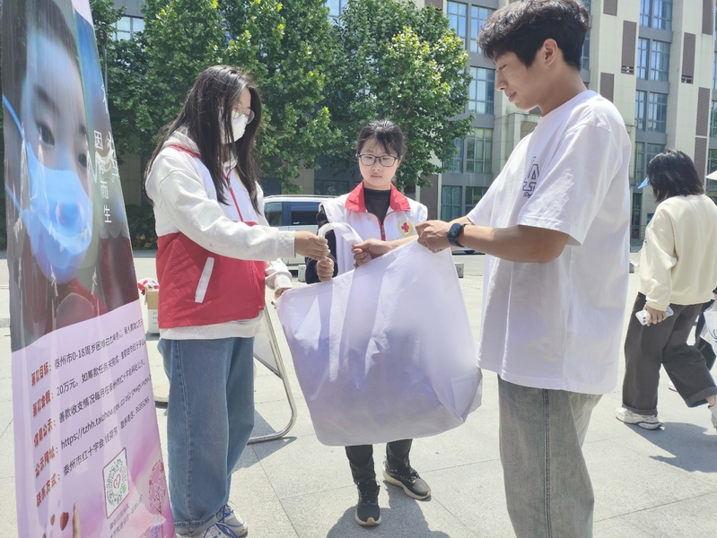 5月6日,校红十字会举办了为期三天的“爱心护佑童享阳光—救助白血病患儿”爱心募捐活动。献出一份爱心,托起一片希望。学校近4000余名师生捐献善款,所筹善款均用于救助泰州市0-18岁患有白血病的儿童。在5月8日当天,校红十字会在西苑餐厅广场举行了"感恩有你,携爱启航”旧衣物、文具、书籍等爱心物资募捐活动。此次募捐活动,受到全校师生的积极响应,累计募集旧衣物4大箱,课外阅读书籍数十本。募集到的爱心物资已全数捐往青海省玉树市囊谦县。与此同时,校红十字会志愿者们还在西苑餐厅广场开展了红十字知识文化宣传活动,向来往师生普及宣传了红十字的起源、基本知识和精神内涵,以及我校红十字会主要工作及主题活动。