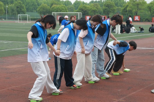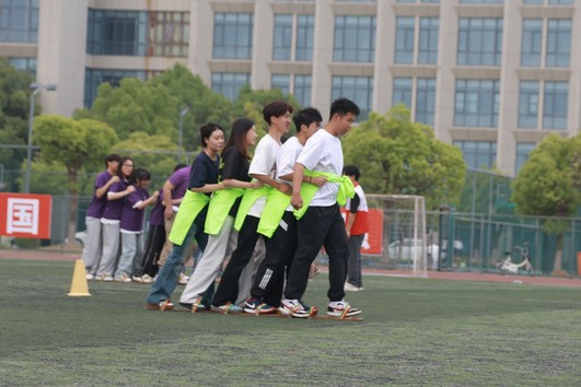 赛前,各学院代表队积极备战;赛场上,运动员们以默契与智慧生动诠释了团队精神。旱地龙舟:队员们口号嘹亮、步伐铿锵,如一条条“蛟龙”破浪前行;默契传递:夸张的肢体动作与爆笑的失误瞬间,化作一场欢乐的“表情包盛宴”;摸石头过河:选手们稳扎稳打,以“步步生莲”的巧思赢得阵阵喝彩;板鞋竞速:五人同足疾驰,跌倒时伸来的援手比奖牌更闪耀;欢乐同心鼓:十人同心牵引,每一次鼓面与球的碰撞都引爆全场欢呼。