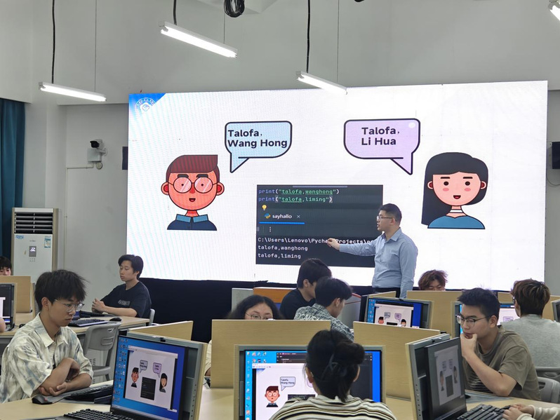 5月26日下午,人工智能与大数据学院精心打造的校级公开课“Python Programming”精彩开讲。本次课程由即将远赴萨摩亚独立国执行国际教育合作任务的马天宇、季星宇两位教师联袂讲授。此次公开课不仅是一次高水平的教学示范,更是其海外教学合作项目的重要预演。学校党委委员、副校长陈芷,国际合作中心负责人及各分院教师代表到现场观摩。