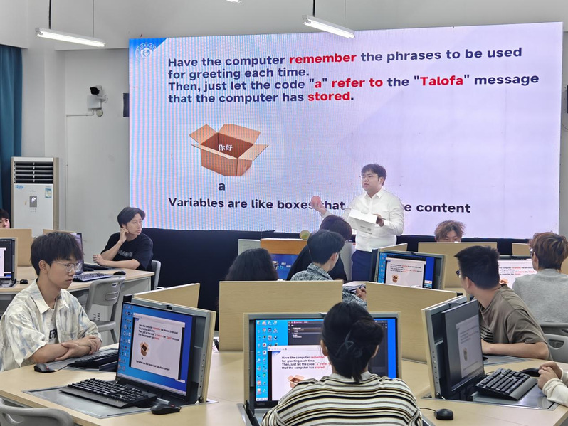 课程聚焦编程核心基础概念——“变量”。马天宇老师全程运用流利英文,用清晰的逻辑解析和代码演示向同学们讲授知识点;季老师则通过生动的案例演示,将抽象理论转化为易于理解的生活常识来讲述,并且辅助马老师为同学们答疑解惑。课堂上师生积极进行全英文互动问答与实操练习,充分展现了学院国际化教学模式的有效探索,也为即将在萨摩亚开展的教学活动积累了宝贵的跨文化实践经验。
