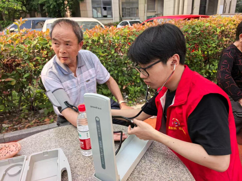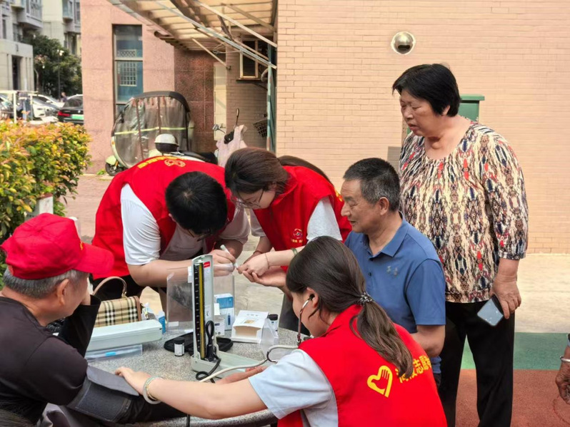 活动现场,节日氛围浓厚,服务热情高涨。师生们迅速投入工作,分工明确,协作无间。在血压、血糖检测区域,他们以高度的责任心和精湛的专业技能,为每一位居民细心操作、精准记录,不仅关注检测数据,更根据居民的身体状况,耐心讲解日常饮食、运动锻炼等方面的注意事项,一一解答居民们的健康疑问。对于血压、血糖偏高的居民,他们反复叮嘱,强调定期复查的重要性,倡导健康的生活方式。