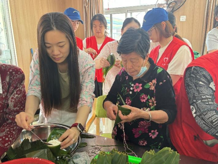 随后,老人们化身“老师”,和师生们一起包粽子。一双双布满岁月痕迹的手与充满朝气的年轻手相互配合,一道道工序有条不紊地进行着。在这个过程中,学生们不仅学到了传统手艺,更从老人们身上感受到了岁月沉淀的智慧和温暖。